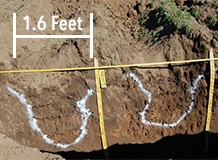 The images below show traditional slip plow ripping in comparison to the Ag Soilworks Vibrosoiler ripper above. As shown below left the bulldozer drives over the ripped row recompacting the ripping line in the process. The center image shows the ripping shape produced by the slip plow which is uneven with only every second 20” being ripped leaving 20” unworked. Within the soil pit analysis we used a penetrometer to determine the quality of ripping and found the bulldozer showed a limited effect in reducing soil compaction with variable results leaving the soil consistency uneven with compacted zones and lumpy boulders throughout the soil profile. There was no blending of broadcast compost and ameliorants into zone.